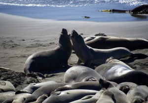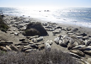 Wir lassen uns vom N° 1 weiter Richtung Süden tragen. Diesmal soll es ein anständiger Campingplatz sein – und zwar vor Anbruch der Dunkelheit. Allerdings strotzt diese Strecke nur so vor tollen Szenerien und Aussichtsplätzen, da kann man schon mal die Zeit vergessen. Dass einem bei den Kurven schlecht wird, ignoriert man einfach, so lang eben möglich. Wir bleiben in dem kleinen Dorf Manchester und widmen uns der ultimativen Reinigung. Bettwäsche, Kleidung und wir selbst. Wir gönnen uns sogar eine zweite Nacht. Der Hot Tub auf dem Campingplatz ist einfach zu verlockend. Leider will das Wetter nicht so, wie wir. Zwei Tage lang gießt es, wie aus Eimern. Scheint in Californien nicht immer die Sonne? Unser nächstes Ziel ist San Francisco, wo wir vier Tage verbringen wollen. Dieser wunderbaren Stadt widmen wir demnächst einen eigenen Artikel. Ehre, wem Ehre gebührt. Weiter also auf dem Pacific Highway, der uns immer wieder den Atem raubt. In Santa Cruz wird an der Promenade gefrühstückt, bevor wir in Carmel by the Sea einlaufen. Dort verbringen wir zwei wunderschöne Tage mit einer lieben Freundin. Genießen einen unglaublich klaren Sonnenuntergang am Strand, ein abenteuerliches, köstliches Essen beim Japaner und gönnen uns den ein oder anderen Mojito. Doch der nächste Morgen war unschlagbar. Wir durften die Dusche in ihrem Hotelzimmer benutzen. Mal davon abgesehen, dass eine Fußballmannschaft rein gepasst hätte, war sie absolut sauber. Keine fremden Haare oder Rasierstoppeln, keine undefinierbaren Flüssigkeiten an den Wänden und auch keine Sandhaufen am Boden. Eine saubere Dusche ist tatsächlich ein Grund für Glücksgefühle. Ach was, Glückseeligkeit! Die nächsten zwei Tage führen uns weiter an Steilküsten, der Bixby Brücke in der Nähe von Big Sur und an vielen tollen Pull Outs mit Meerblick vorbei. Wer hat schon Schlafzimmer, Küche, Bad, Esszimmer und Fahrerkabine mit andauerndem Pazifikpanorama? Wir passieren bei strahlendem Sonnenschein den Strand der See-Elefanten. Hunderte Weibchen und Bullen liegen dicht beieinander, um sich zu wärmen. Wie uns ein ehrenamtlicher Biologe vor Ort erklärt, kommen diese riesigen Robben jährlich zum selben Ort, um zu fasten und sich fortzupflanzen. Fasziniert beobachten wir die Tiere. Letztendlich ist auch der Highway N° 1 zu schnell zu Ende. Aus Pazifikküste wird Agrarlandschaft mit mexikanischen Hilfsarbeitern. Man passiert kleine Städte, in denen hauptsächlich die kastilische Sprache zu hören ist und man kauft seine Lebensmittel im mexikanischen Supermarkt. Ein erster Vorgeschmack, auf unser nächstes Reiseland. Also auch, wenn Abschnitte vorüber gehen, liegt hinter der nächsten Kurve ein spannendes, neues Kapitel. Man muss nur hinsehen.